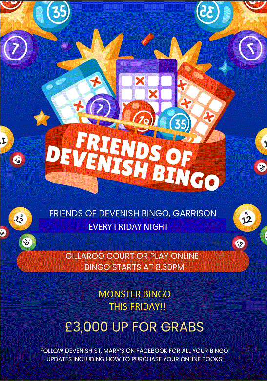 Monster Bingo will start at 8.30pm on Friday. Doors will open at 8pm, with £3,000 to be won! Online books are on sale until 10pm tonight.